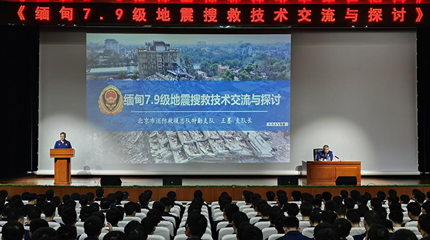 讲座以《缅甸7.9级地震搜救技术交流与探讨》为题,从地震灾害介绍、中国救援队介绍、国际救援流程、地震救援技术交流、经验体会等五方面和师生们分享交流。王墨支队长结合参与救援行动的所见所感,重点介绍了包括中国救援队在内的多支中国救援力量坚决贯彻落实习近平总书记重要指示批示精神,争分夺秒、科学施救,用专业与汗水书写中国担当,展现中国速度、中国温度的救援历程以及坚持科技赋能,推动救援从“人海战术”向“智能突围”转变的工作经验,让大家对这次我国出动人数最多、速度最快的国际救援有了更具体、更深刻理解。