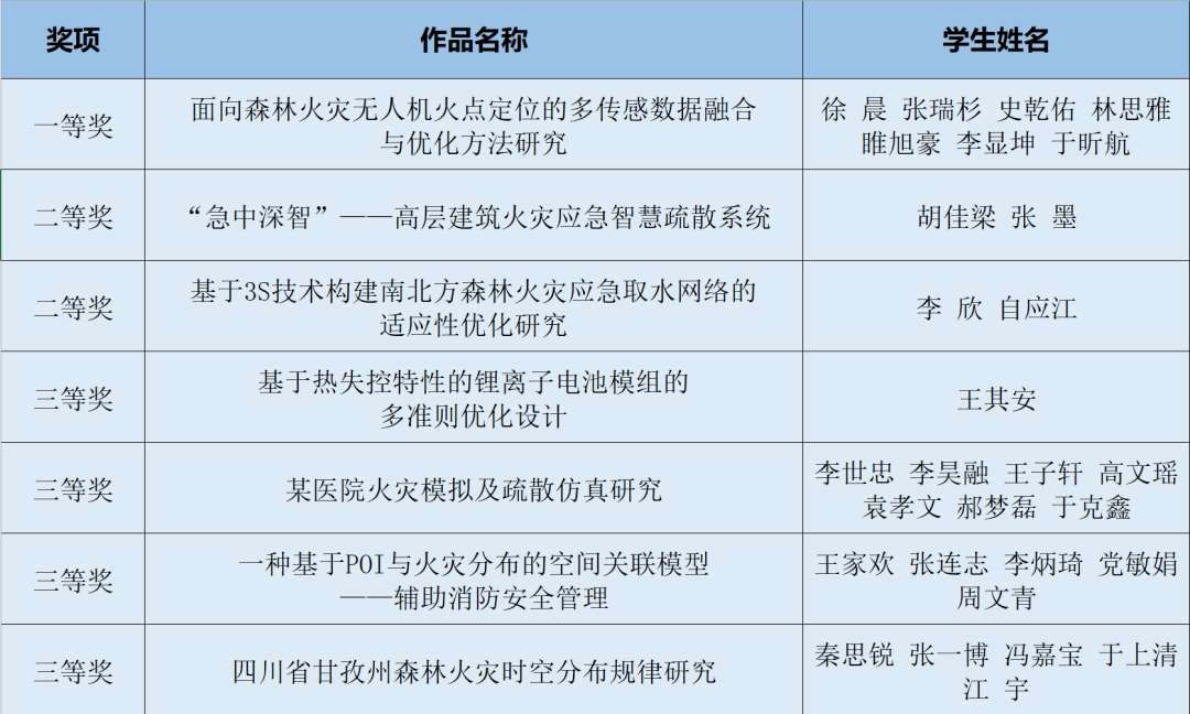 本届赛事启动以来,学院党委高度重视,教务处会同消防工程系严密组织,21名教师悉心指导,助力29名学员斩获佳绩,获奖名单如下: