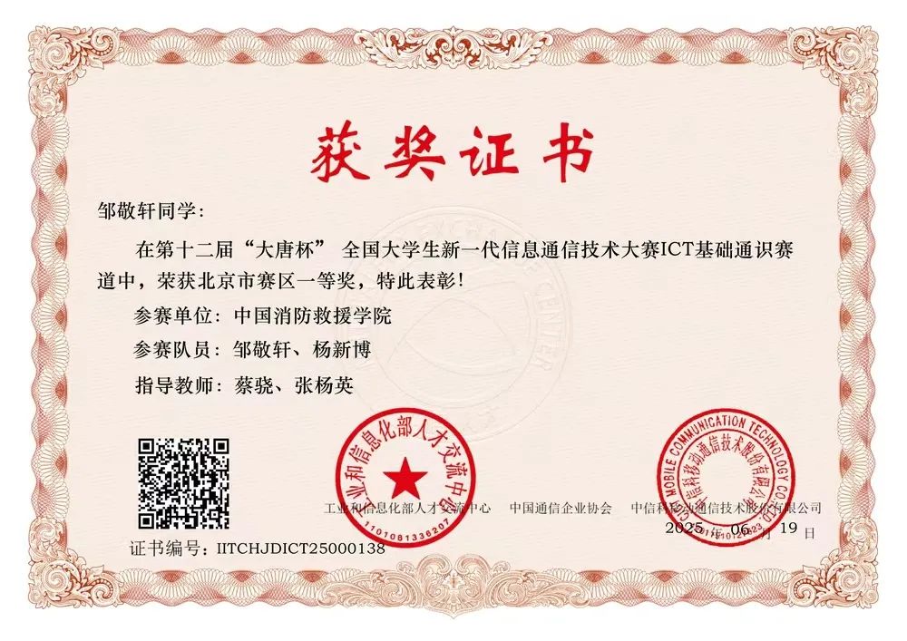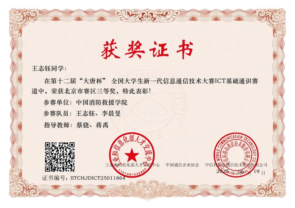 在刚刚落下帷幕的第十二届“大唐杯”全国大学生新一代信息通信技术大赛中,williamhill英国中文官网组织14名2022、2023级飞行器控制与信息工程专业学员,参加了赛道三(ICT基础通识赛)的角逐,与全国各大高校的优秀学子同台竞技,经过省(赛区)赛和全国总决赛两轮激烈角逐,最终斩获全国三等奖1项、北京市一等奖1项、北京市三等奖1项,消防学子首次参赛即成功跻身全国总决赛并喜获佳绩。