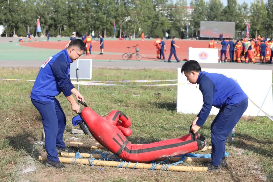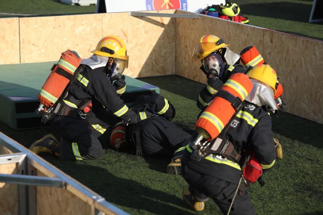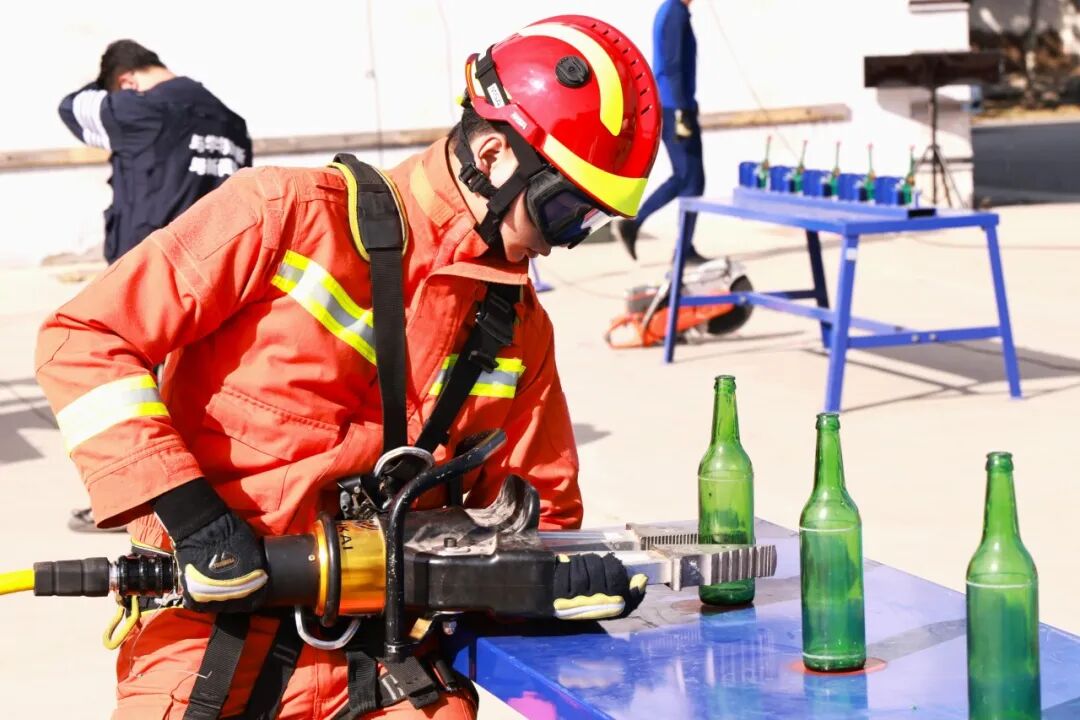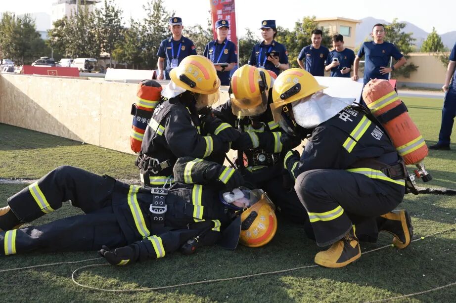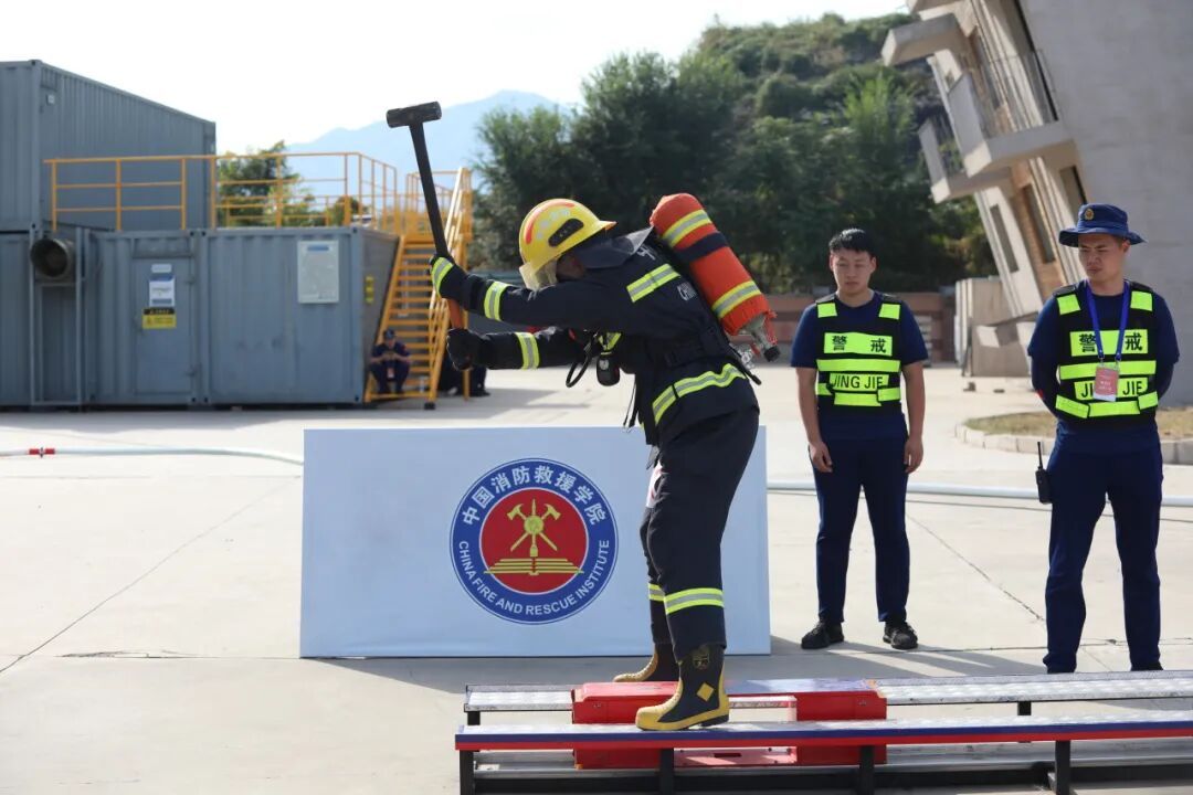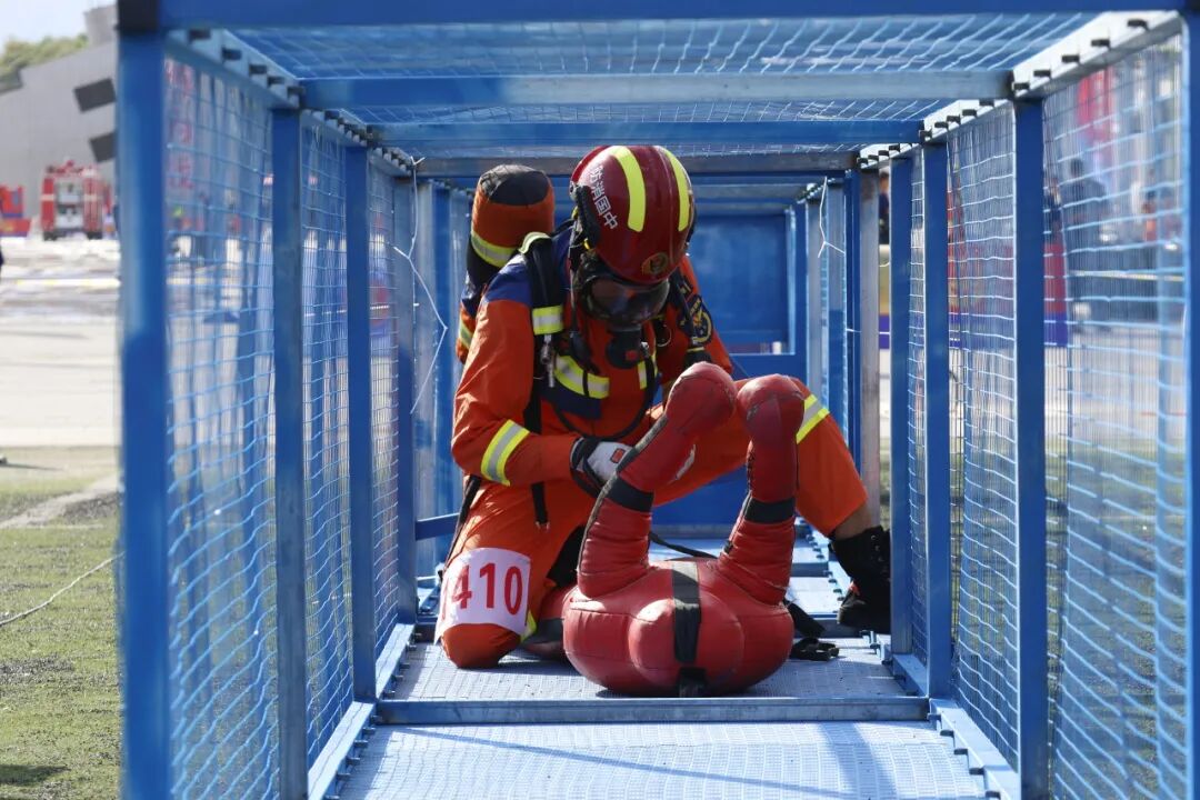 50米赛道模拟废墟救生,选手破拆防盗门、切圆木,携空呼闯障碍笼道,拖60公斤假人逃生,显消防铁军实力。