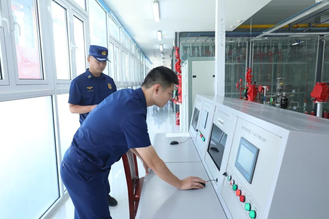 队员识消防控制柜故障、查线路测电压,按流程启消防水泵并观压力表,操作严谨精细。