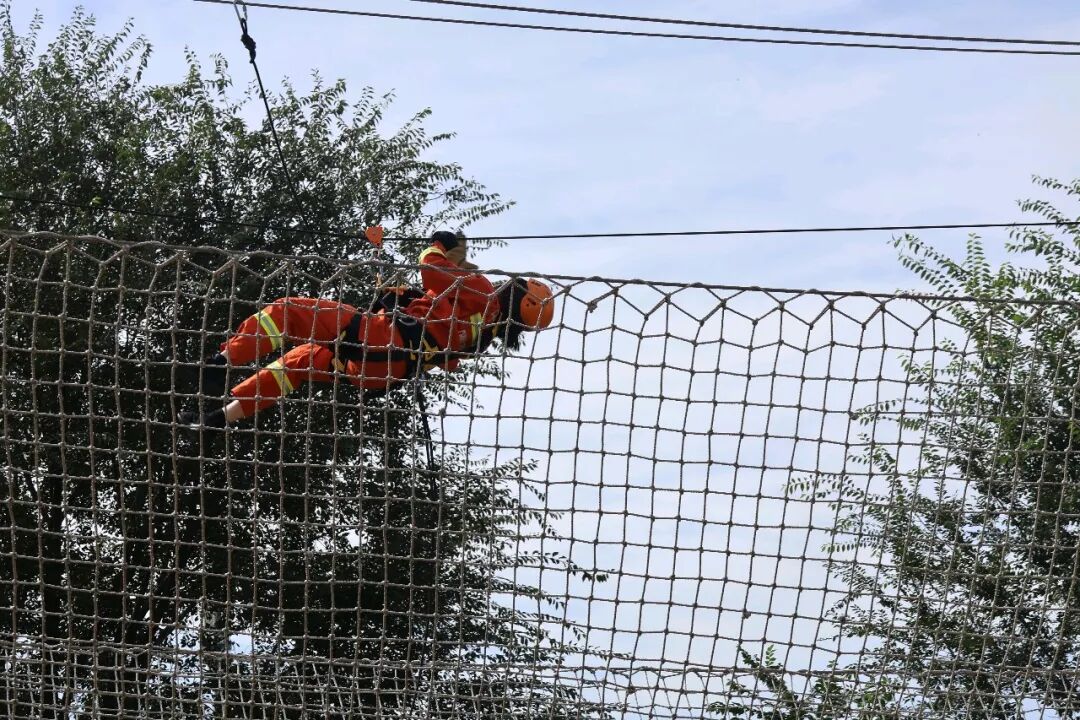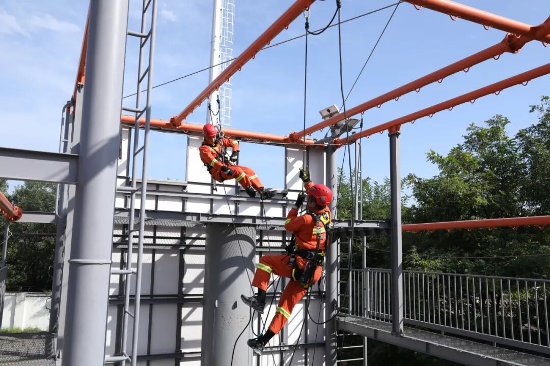 队员穿全身安全吊带,握上升器蹬脚踏绳发力,匀速攀升并有序收放绳索,升至15米高空稳停指定位置,向地面比“安全”手势,动作沉稳如钟,展高空救援定力。