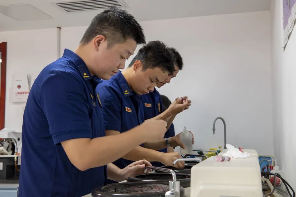 队员打磨、抛光金属试样,浸腐蚀液控时,清洗吹干后用显微镜观金相组织,行云流水显专业判断力。
