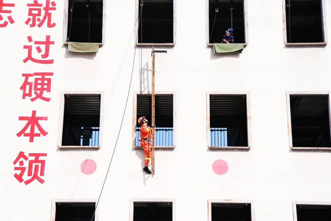 队员握梯抵墙发力,梯挂3层窗台,悬空靠手脚支撑攀爬,不到10秒登顶,展“飞檐走壁”救援硬功。