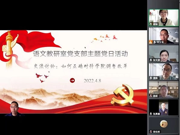 根据学院改革发展需要和当前人员思想形势实际,4月8日,语文教研室党支部以“如何正确对待学院调整改革”为主题,以党支部为单位,采取视频会议的形式,组织支部成员与积极分子开展了一次广泛的讨论交流。会议由语文教研室党支部书记邓文华同志主持,基础部副部长李醍同志以普通党员身份参加组织生活会。