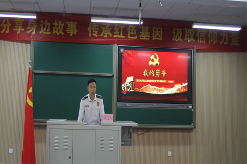 贾昂同志以“我的爷爷——我的大山”为题,向我们娓娓道来了一位白发苍苍老人,一位如山般纪律严明的爷爷,一位将信仰刻进骨子里的党员。“爷爷似大山,更是我的榜样,我要像您一样,在平凡的岗位上建功立业,让红色基因代代传承。”