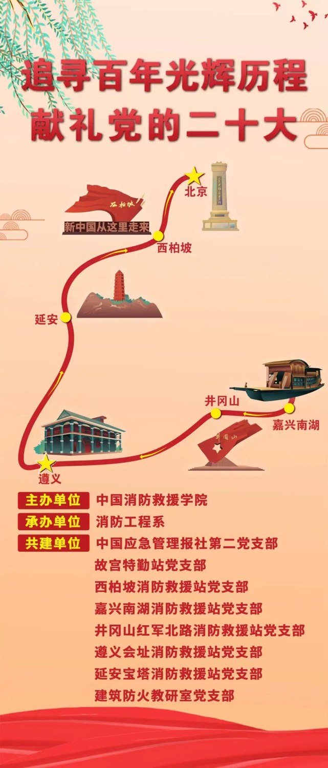 中国应急管理报社第二党支部、西柏坡消防救援站、井冈山红军北路消防救援站、遵义会址消防救援站、延安宝塔消防救援站、嘉兴南湖消防救援站、六盘水钟山大队人民中路消防救援站、广州黄埔大队萝岗消防救援站党支部的全体指战员,学院全体教师和学员参加了此次活动。